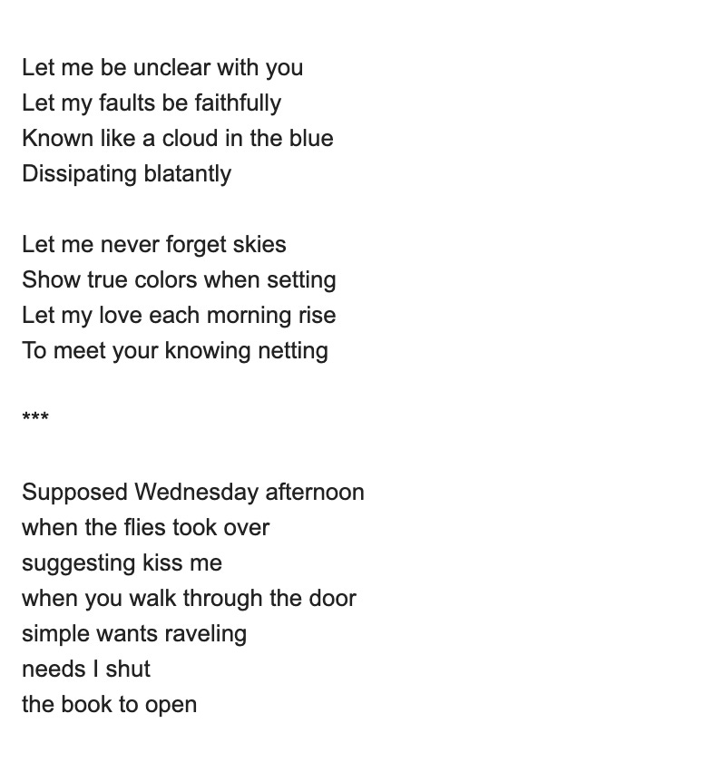 I tend not to care about rhyme in my poems but I felt the need to try for any song to be possible. And the other poem was one that I had written differently in my notes a while ago that I applied some light edits and line breaks to. Though I think of these as two poems, they do seem to live together. Thematically, literally, wantingly. That might be enough to make them one.